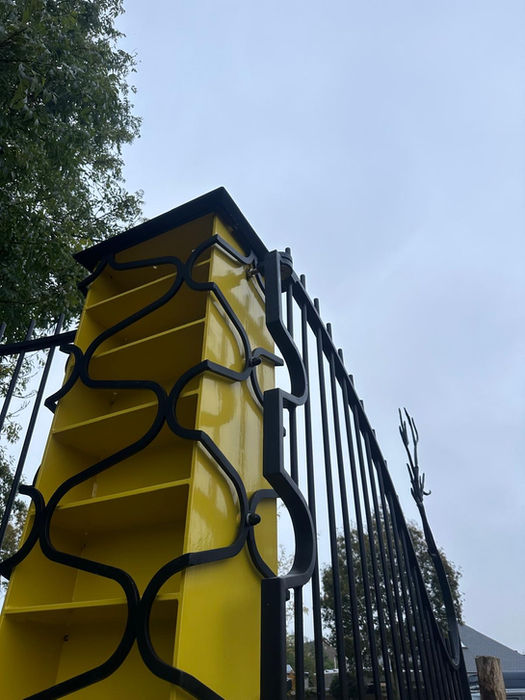 Stalen poort, ontworpen door Annet Bult en gerealiseerd in samenwerking met Jaap Boers (smid bij het Zuiderzeemuseum). Deze poort staat bij MAK Blokweer in Blokker.”